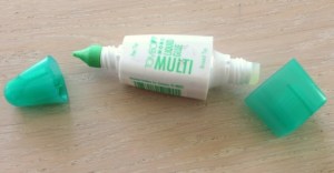 Er liegt gut in der Hand, hat zwei unterschiedliche Seiten zum Öffnen, wobei ich fast ausschließlich die feine Spitze verwende. Beim Auftragen ist er zunächst weiß und trocknet dann transparent. Man kann mit ihm vor allem Verpackungen kleben. Größere Spannungen hält er gut aus! Man muß nur schnell sein: Korrekturen und leichtes Verschieben der Papiere ist nur kurz nach Auftrag möglich! Danach hält er bombenfest!