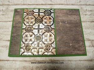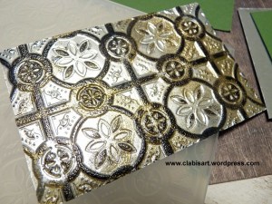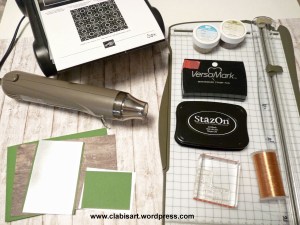 1. Material: Embossing-Fön, BigShot, Prägefolder, Kartenzuschnitt, Folienpapier in Silber, deshalb Embossing-Pulver in Gold und Kupfer, Versamark-Tinte, Stazzon-Tinte, Stempel nach Belieben und evtl. Embellishments