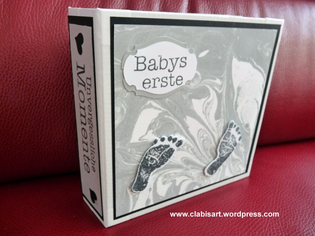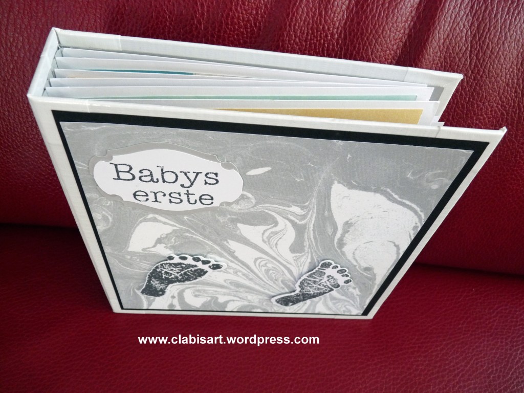 Minialbum zur Geburt eines Jungen in Schiefergrau/Weiß. Im Inneren wurden noch zarte Farben in Aquamarin und Currygelb für die Seiten verwendet.