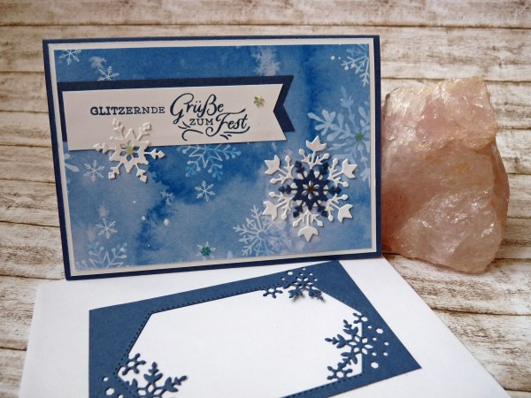 Mit dem neuen Designpapier in tollen Blautönen und ein paar toll glitzernden selbstklebenden Sternpailleten hab ich mich in das neue Set total verliebt.