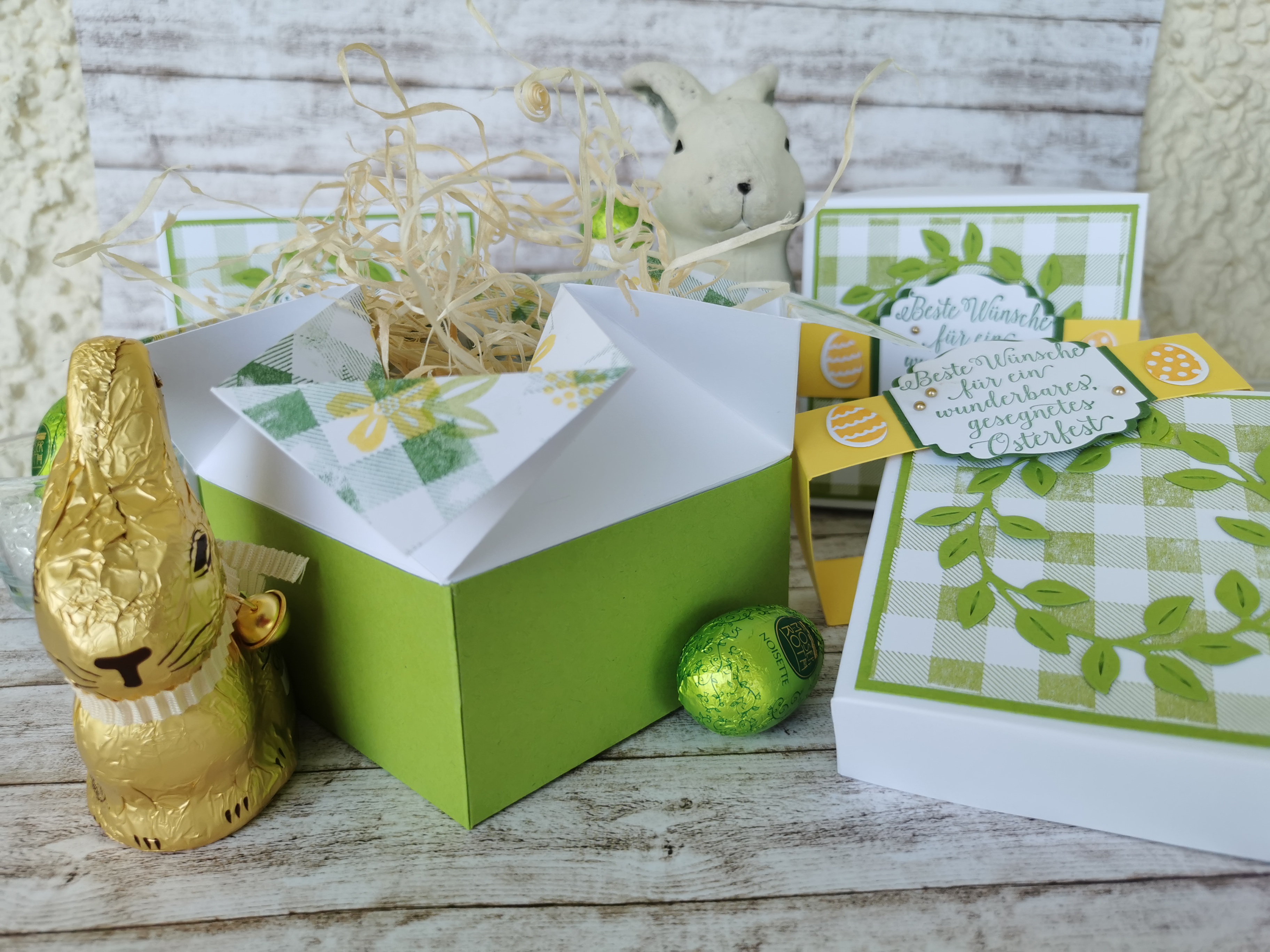 So eine Geschenkbox überrascht jeden Beschenkten beim Auspacken. Der gefaltete Deckel öffnet sich total cool, wenn man an zwei gegenüberliegenden Ecken zieht. Ich habe daraus ein Osternest gewerkelt. Die Anleitung findet ihr bei Indra Biendl auf Youtube. Sie war die Inspiration für mich. Vielen dank dafür!
