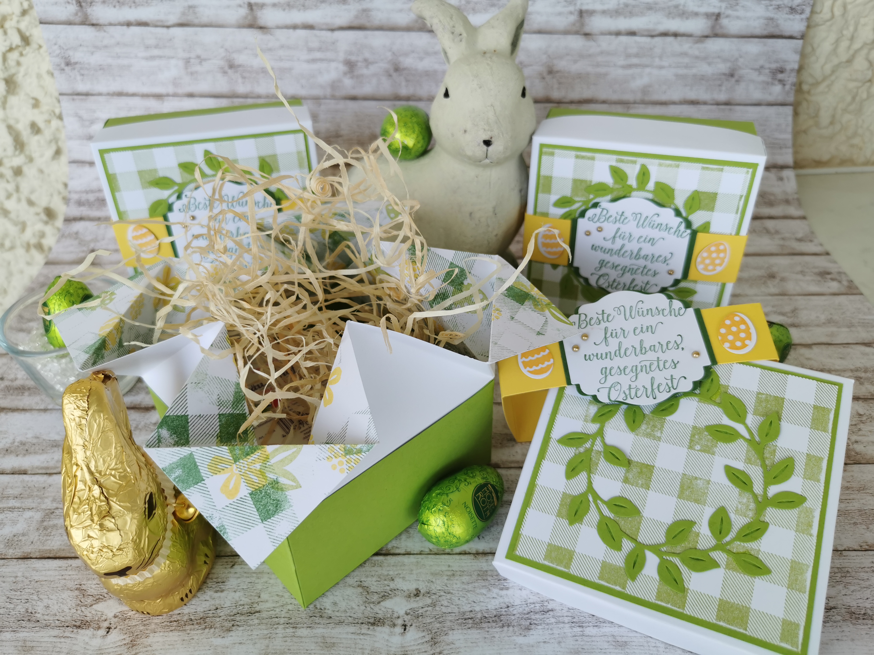 In der Box hat so einiges Platz. Ich habe eine Pflegehandcreme (aus meiner Apotheke) für strapazierte Corona-Hände darin unter Ostergras und ein paar Schokoeiern versteckt.