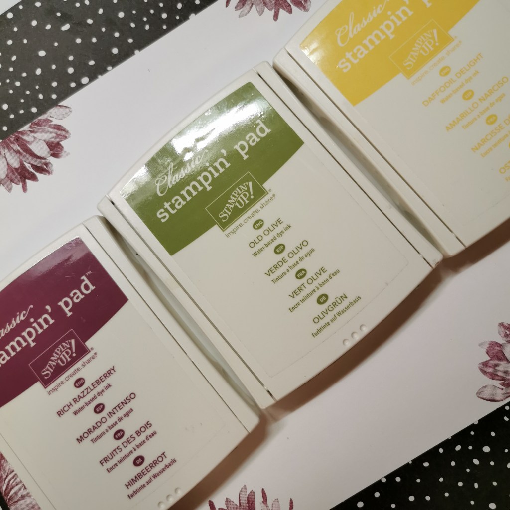 Jetzt zeige ich euch mein selbst gestempeltes Designpapier mit diesem extravaganten Stempelset mit den spätsommerlichen Farben Olivgrün, Himbeerrot und Osterglockengelb: