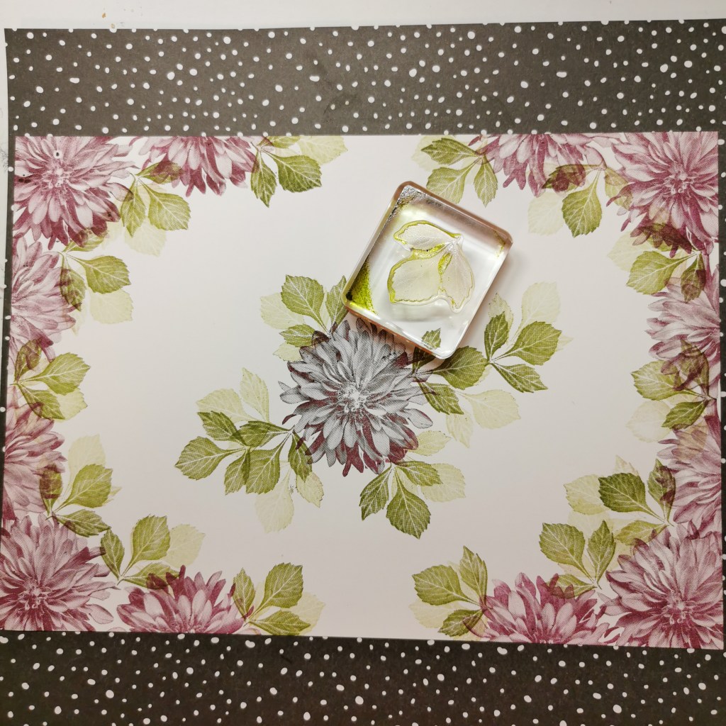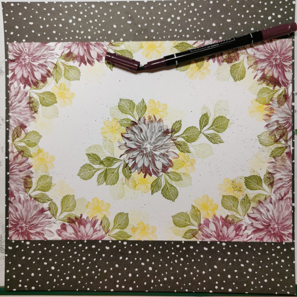 Die große flächige Dahlie habe ich in Himbeerrot gestempelt, dann die Blätter in Olivgrün (mit erstem, zweiten und dritten Abdruck) und dann noch die kleine Blüte aus dem Dahlienset in Osterglocke (auch hier zwei Abdrücke pro einmal Stempelfarbe):
