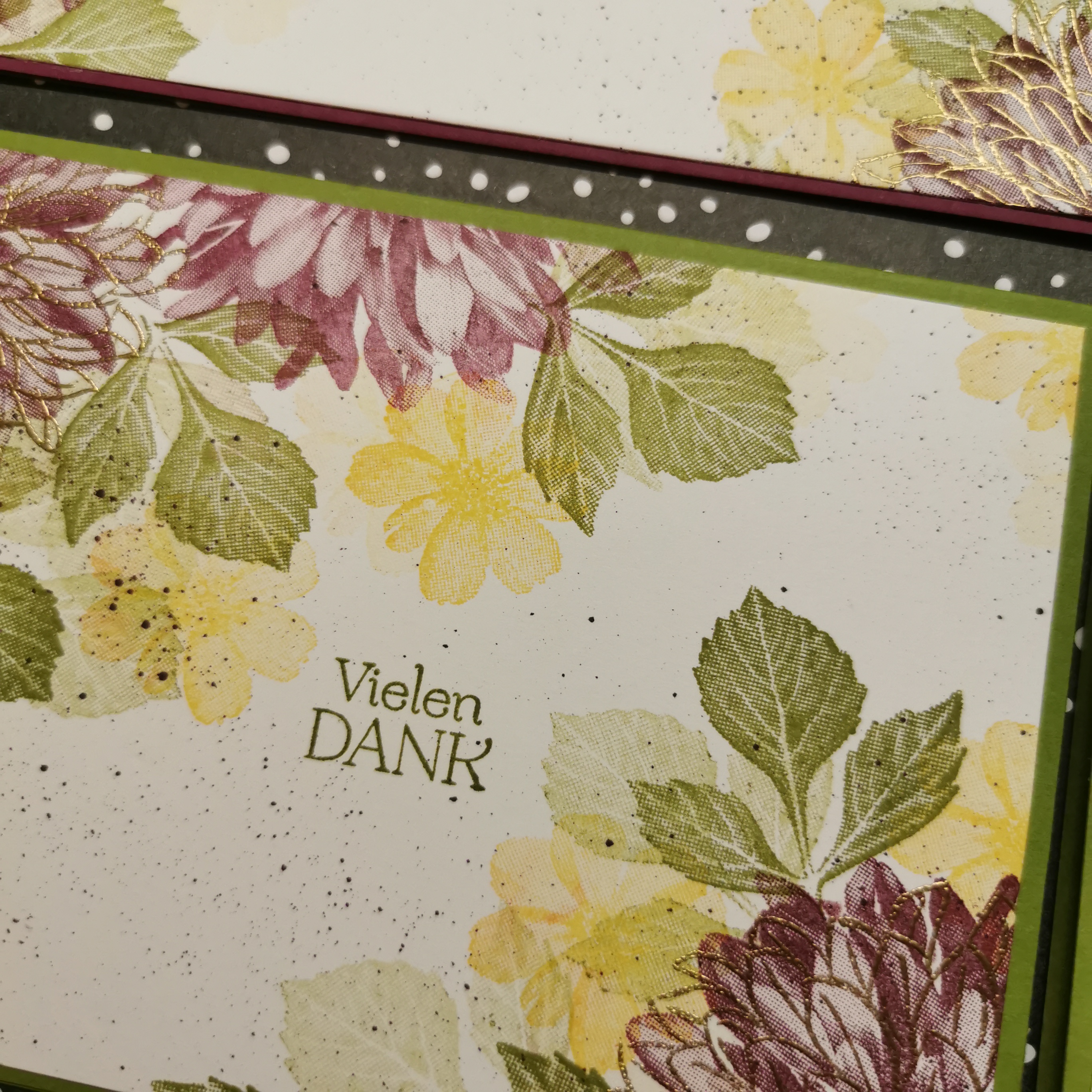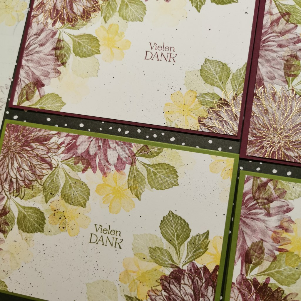Das DIN A4 bestempelte Blatt habe ich in vier gleich große Rechtecke geteilt und als oberste Lage meiner Karten verwendet. Ein Dankesgruß durfte nicht fehlen: