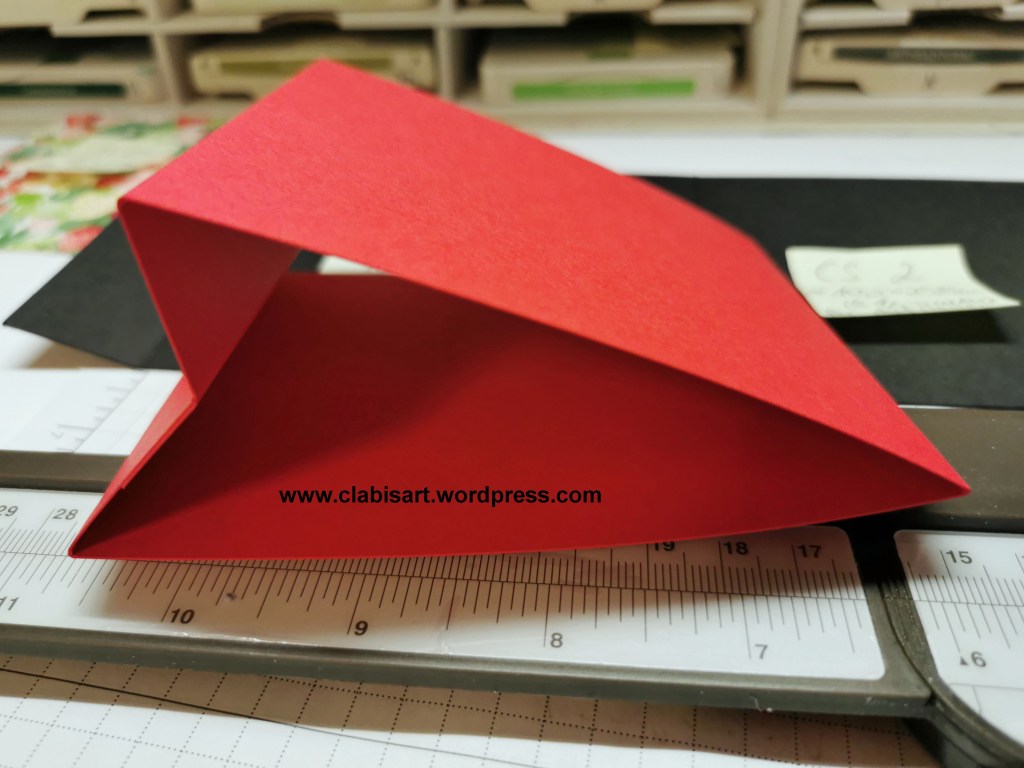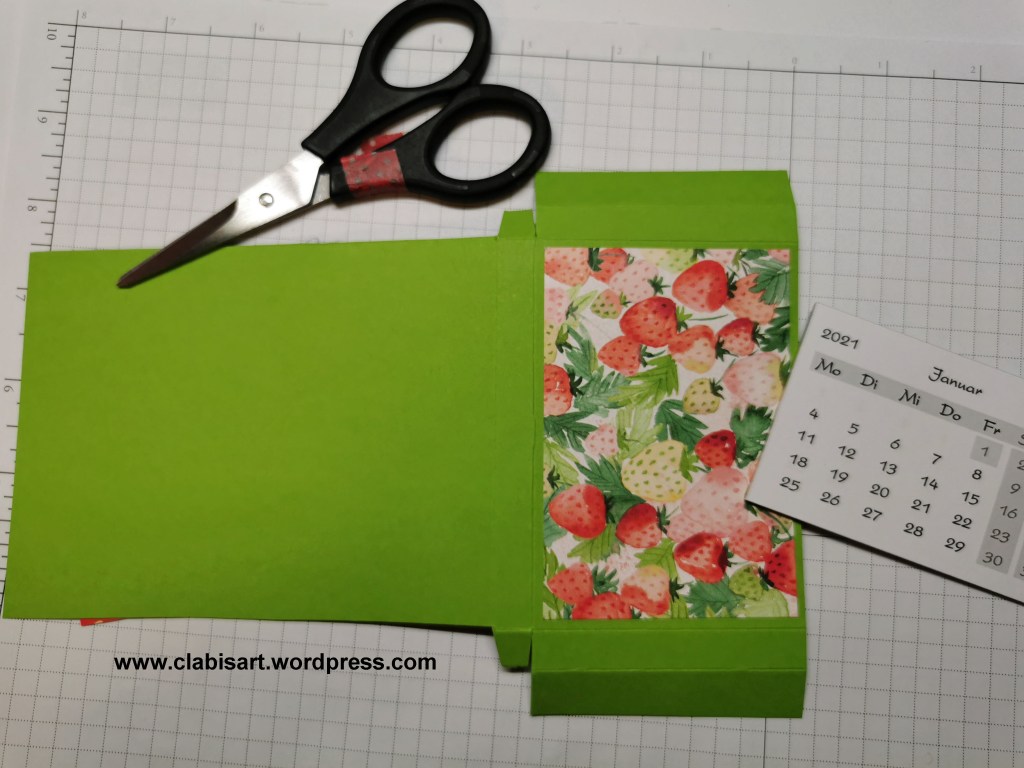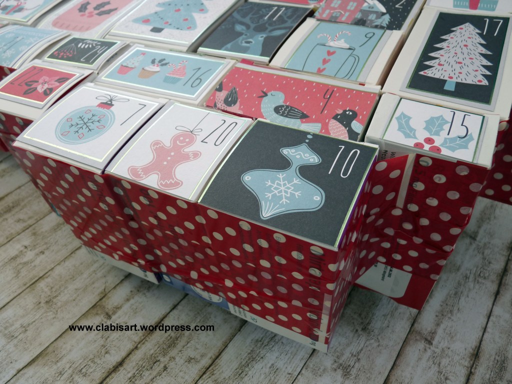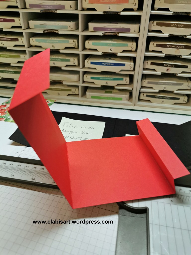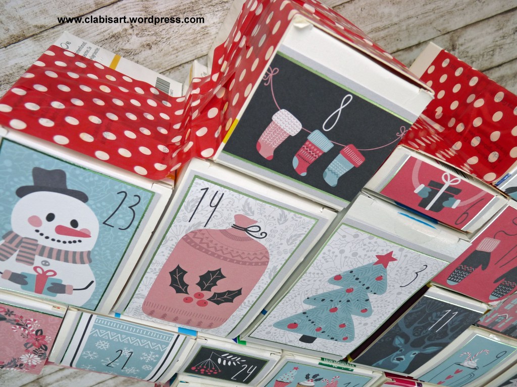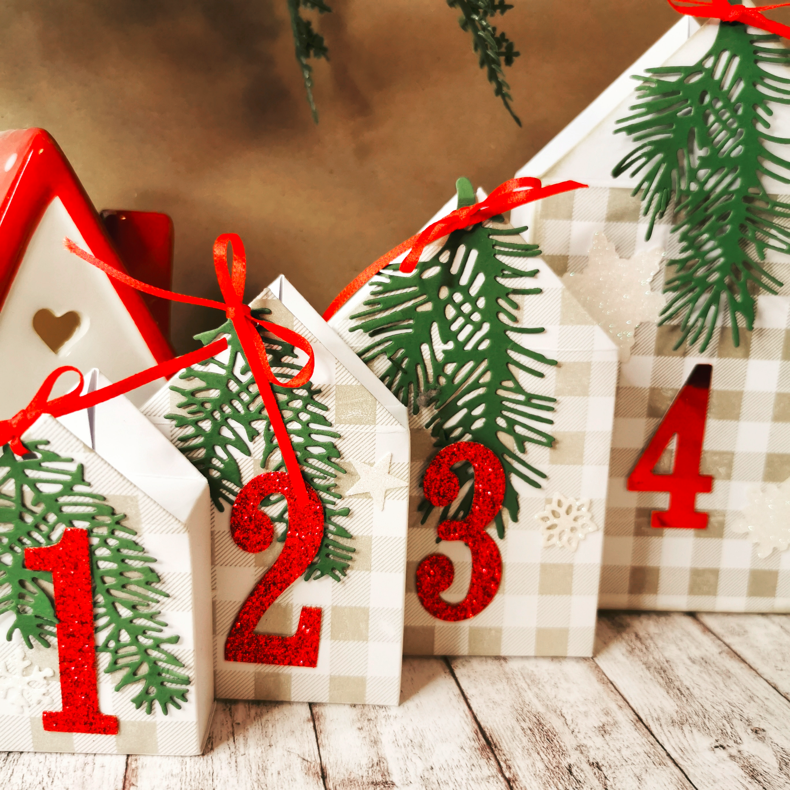 Das ist mein Adventskalender für die vier Adventssonntage in Haeuschenform. Geschmückt habe ich sie mit einem gestanzten grünen Doppelzweig, der aussieht wie frisch von einer Tanne, roten Glitzerzahlen und einem roten Satinschleifchen. Das weiße Cardstock wurde mit einem großen Hintergrundstempel in Karoform bestempelt. Als Deko kann ich sie jedes Jahr wieder hervorholen und schön auf ein Tablett oder Adventsteller dekorieren.