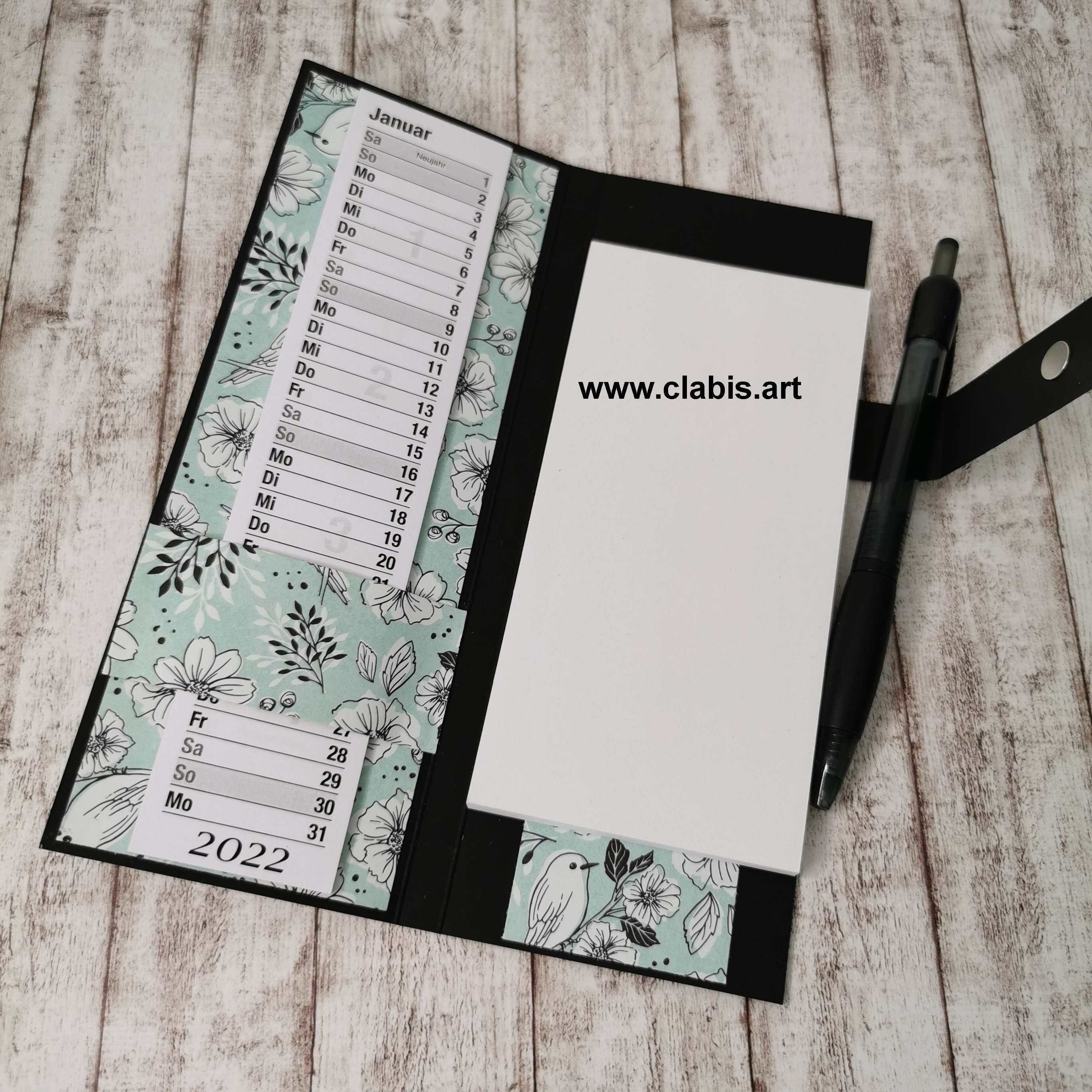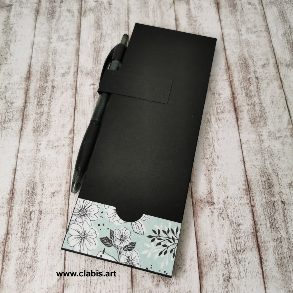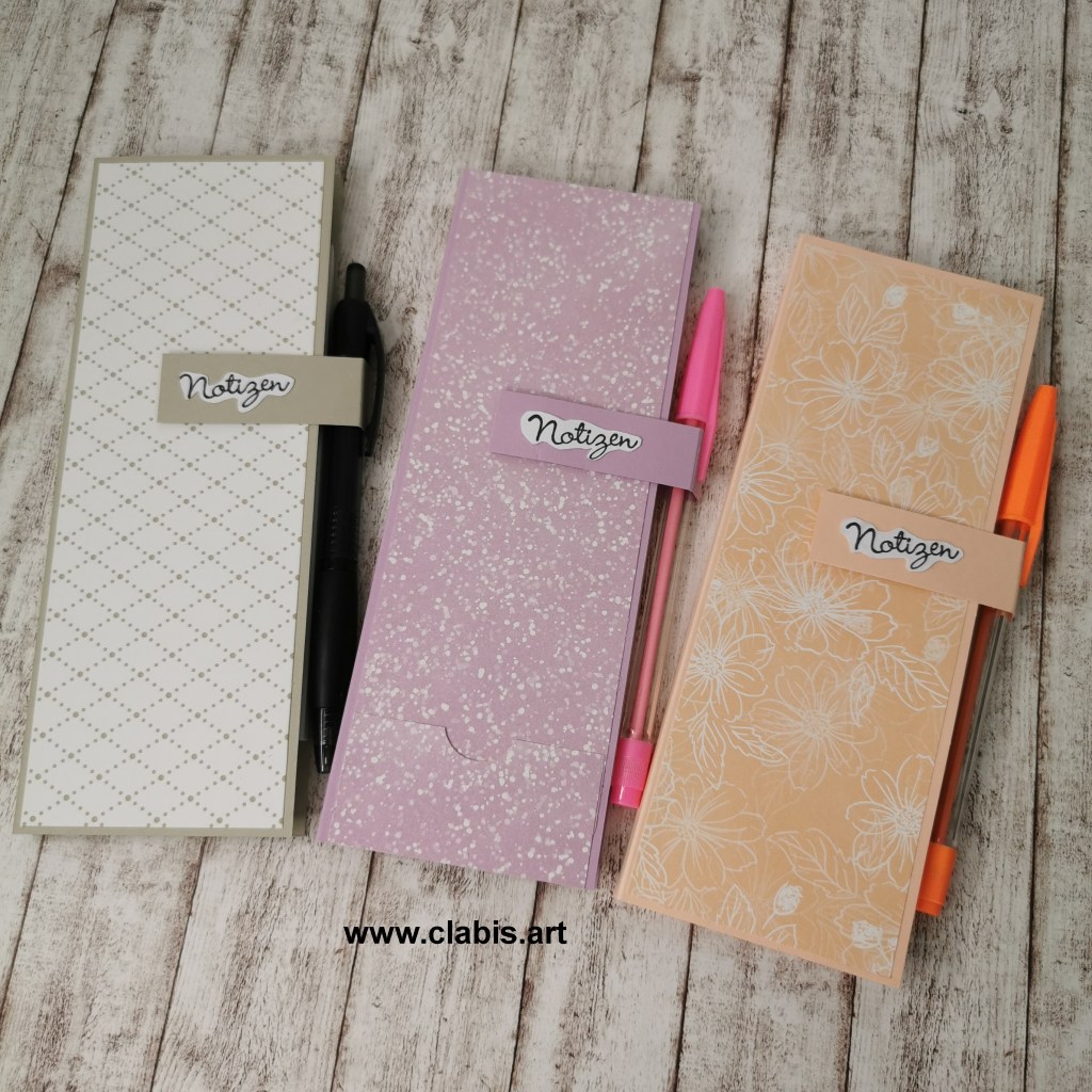 Hier seht ihr meine Notizkalender von vorne, von innen und von der Rückseite. Je nachdem wieviel Designpapier ich gerade zur Verfügung habe, ergänze ich noch Laschen oder Taschen zum Unterbringen von Zetteln wie Kassenzetteln. Meist sind es Designpapierreste, die ich hier verarbeite!