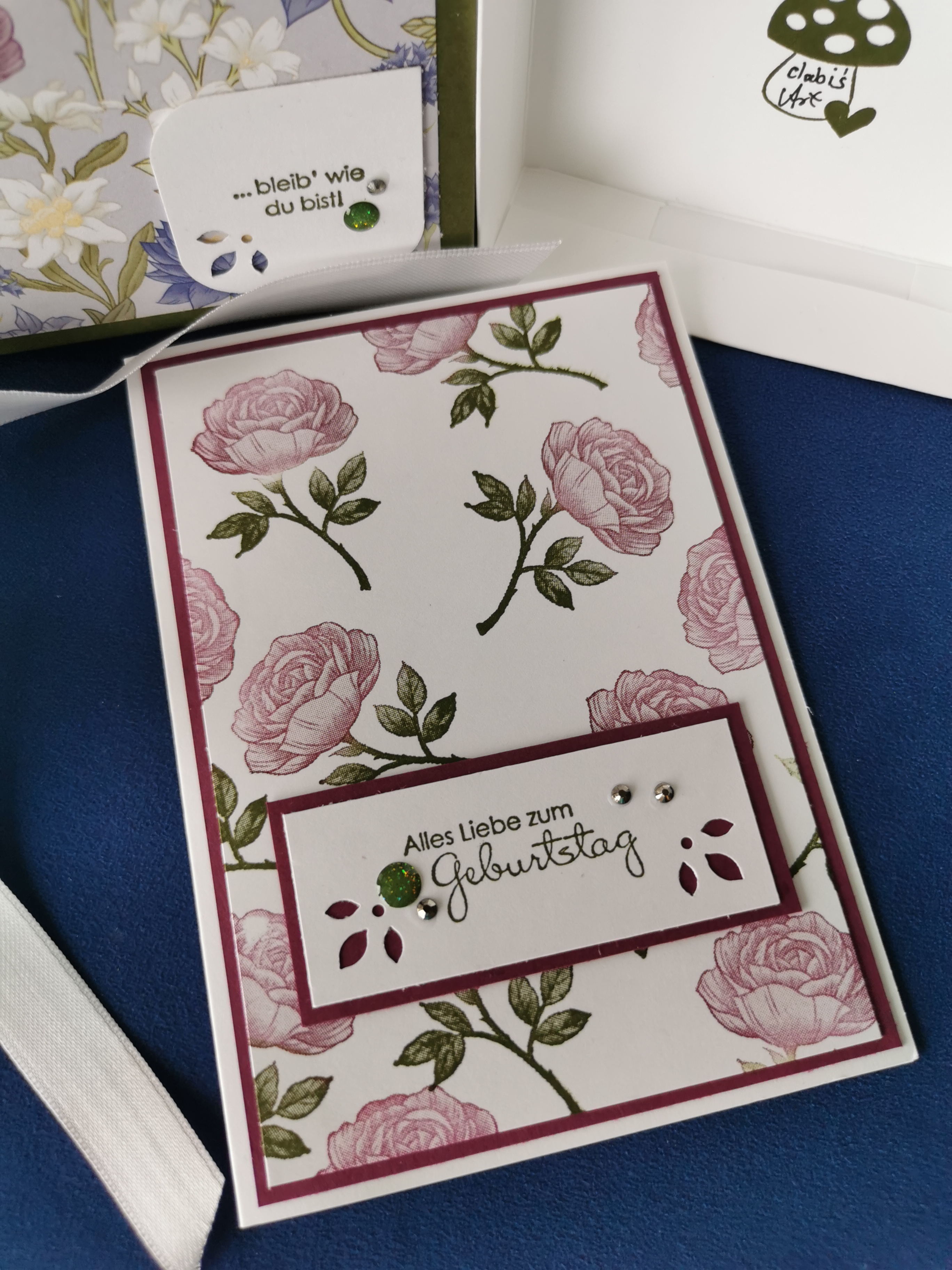 Zum Ende des Rosenmonats zeige ich euch eine Rosenverpackung (Upcycling einer leeren Müsliverpackung) mit rosigem Inhalt (kann ich leider hier noch nicht zeigen, da das Geschenk noch nicht verschenkt ist) und eine passende Rosenkarte dazu.