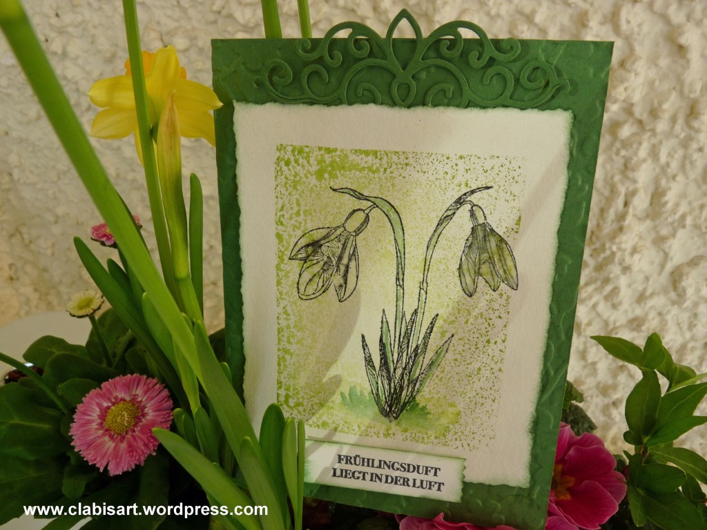 Die Karte ist auf Aquarellpapier gestempelt. Zum Set gehört auch das verschnörkelte Embellishment, das ich in Gartengrün als oberen Rahmen gesetzt habe.