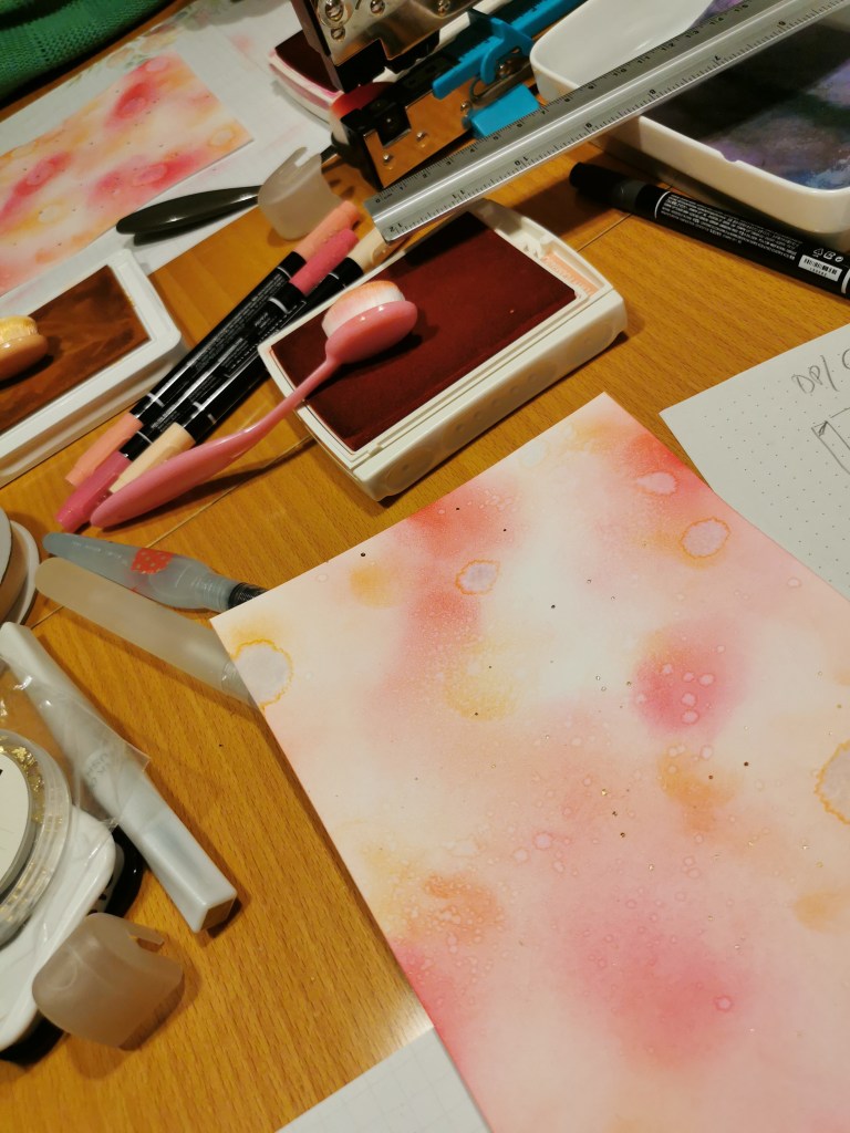 Ich habe die Plastikverpackung meines Stempelkissens als Ersatz-Acrylblock verwendet! Da es ein einfacher Ast-Stempel ist, der nicht soooo genau platziert werden muß, kann ich hier auf die Durchsichtigkeit (gezwungenermaßen, ich war unterwegs) verzichten!
