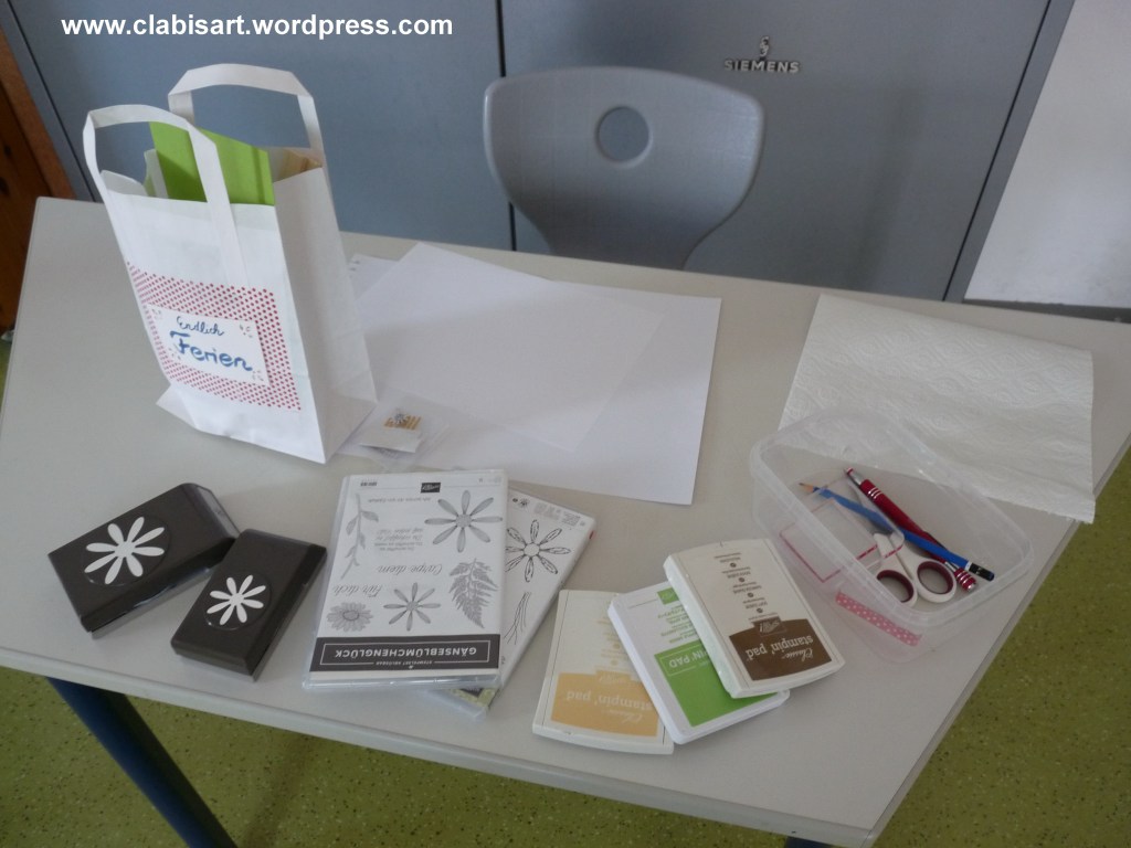 So kommt es , daß dieses Jahr für jeden ein eigener Tisch mit Stempelfarben, Stempelsets, passenden Stanzen und Acrylblöcken zum Montieren der Stempel bereit stand. Das Material zum Verbasteln gab es wie immer in einer neu designten Papier-Tragtasche.