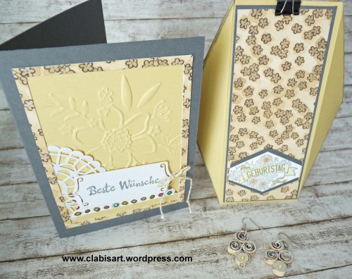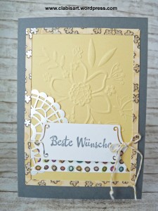 Dieser Aufleger wird auf die Kartenbasis geklebt. Nun könnt ihr zum Beispiel einfache größere Glückwünsche auf Flüsterweiß mit Schwarz stempeln, zuschneiden und mit Abstandsklebern festkleben: