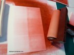 Die Farbwalze wird gleichmäßig mit Stempelfarbe benetzt. Man rollt von einer Seite kommend über das vorbereitete Papier. Diesen Vorgang wiederholt man so oft, bis einem das Ergebnis gefällt: