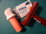 Die Rolle meines Brayers kann man lösen. Der Netzverband (aus der Apotheke) passt genau darauf. Jetzt den Brayer mit Farbe gleichmäßig einfärben und nur einmal über das vorbereitete Papier walzen.