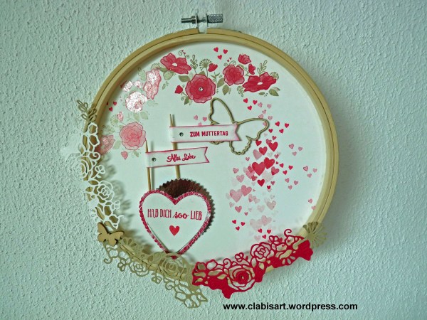 Die Blumencollage im Bilderrahmen habe ich mit einem 12mal 12 Inch Designpapier („Sternenhimmel“ von Stampin`Up!) hinterlegt. Eine Blume sitzt keck mit passendem Samt-Schleifenband auf dem Rahmen. Ein Schmetterling hat sich zwischen die vielen Blümchen gemischt. Habt ihr ihn entdeckt?