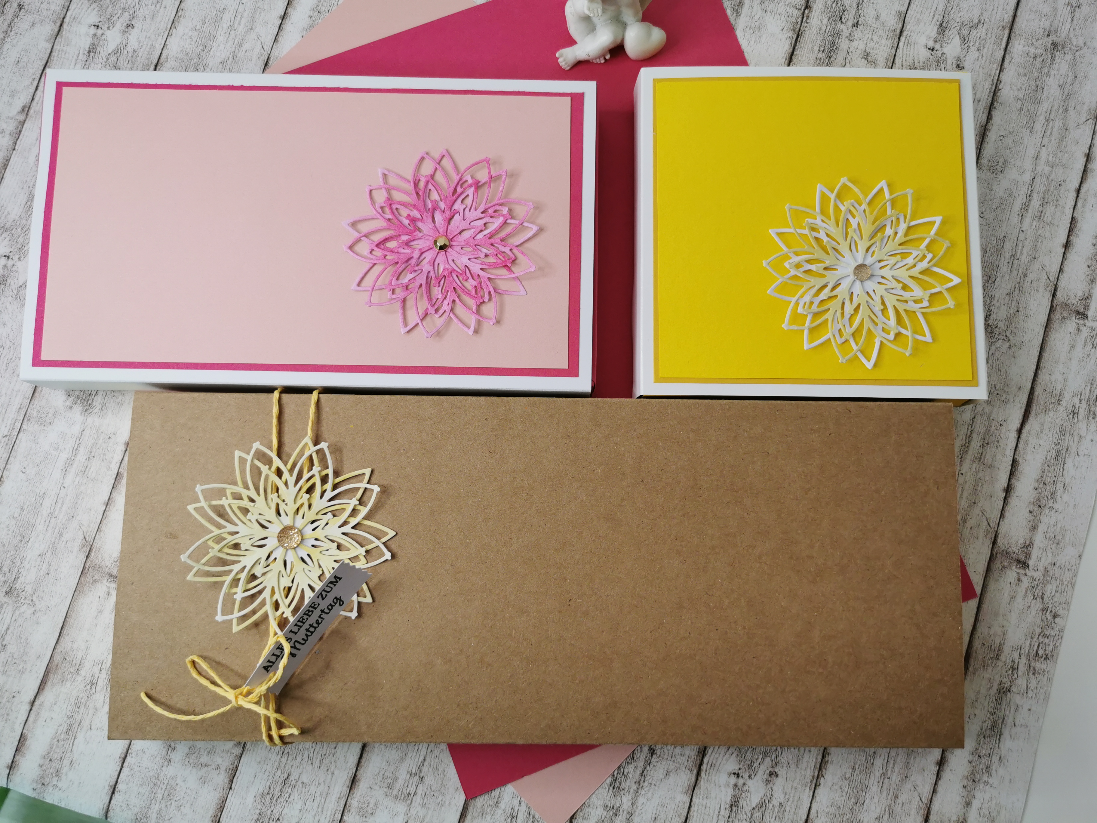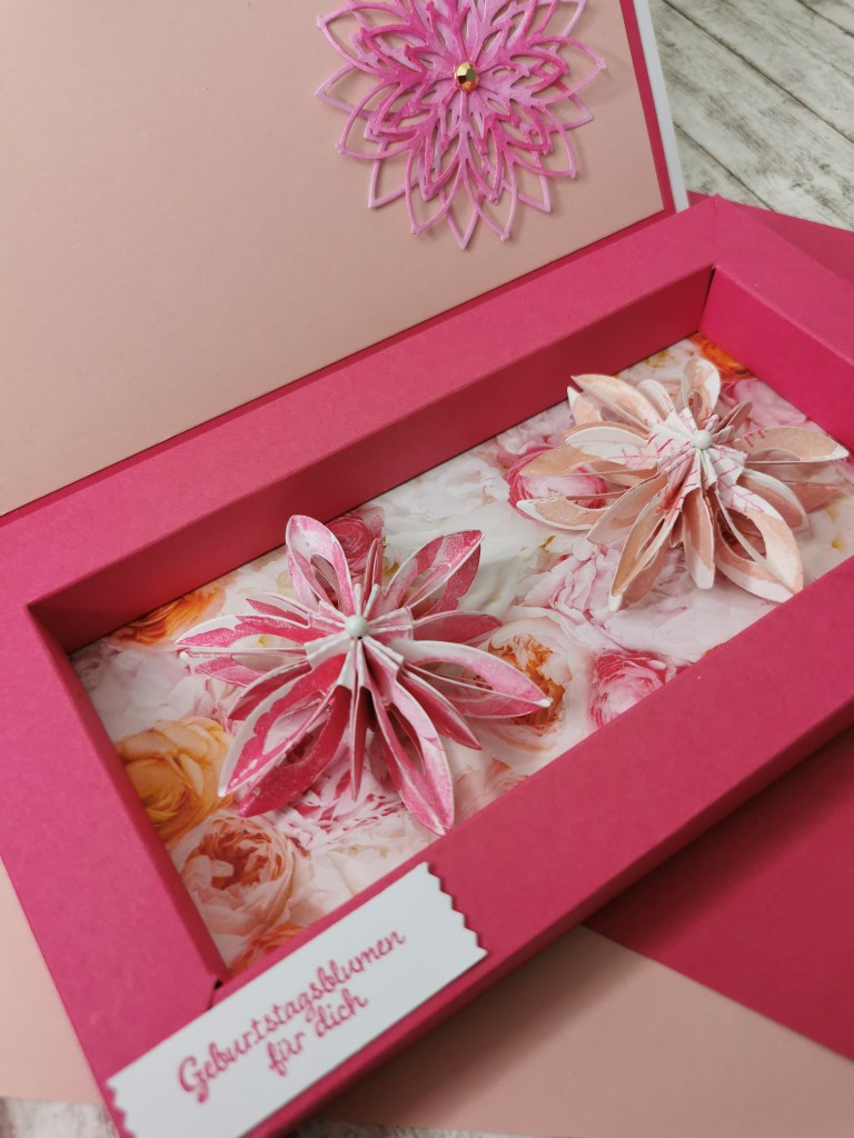 Das nette Clutch-Täschchen kann mit vielen Geschenken (Gutscheinen, Geldgeschenk, Schokolade, ….) bestückt werden: