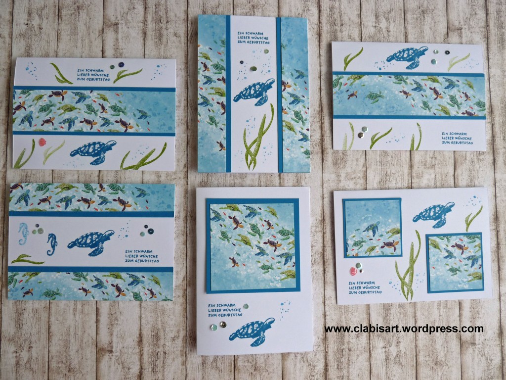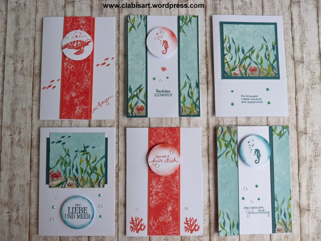 Zur Auswahl standen das Designpapier Ganz mein Geschmack (Bestellnummer 152494, 24 Blätter, 12mal12 Inch)) oder das total bunte Designpapier Meereswelt (Bestellnummer 152460, 48 Blätter, 6mal6 Inch) von Stampin`Up!.